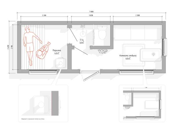 Базовое наполнение бани включает в себя установку пологов в парном помещении, согласно схемы планировки – лежачий и сидячий полог. Сидячий глубина 45 см высота 43 см, лежачий - глубина 70 см, высота 90 см. Сидячий полог может быть выдвижным - доп. опция, стоимость уточняйте.