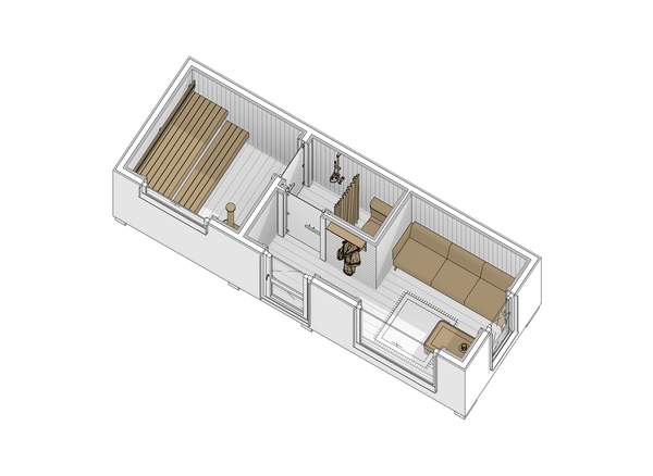 Комфортное размещение от трех до четырех человек. Сделано по каркасной технологии: в стенах, кровле и в полу 100 мм утеплителя. Комплектация бани - готовая к применению после установки на участке.