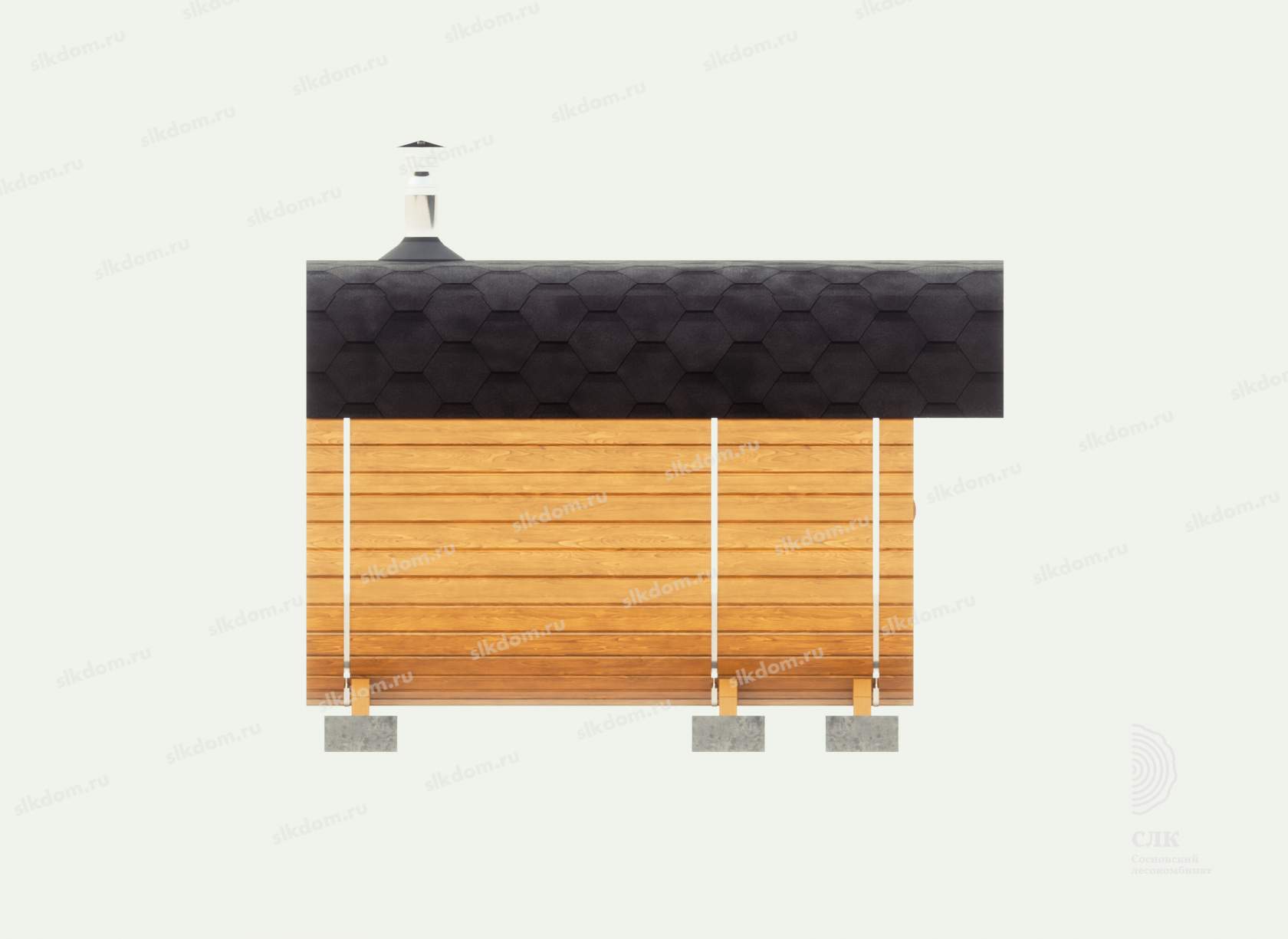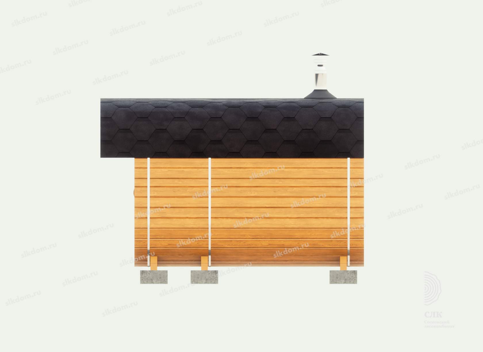 Корпус бани и внутренние перегородки выполнены из сухой доски камерной сушки (влажностью не более 16%), материал хвоя, ламели (доска) запилены в лунный паз и состыкованы между собой, размер 145x45 мм. Ширина и высота корпуса 210 см по внешней стороне.