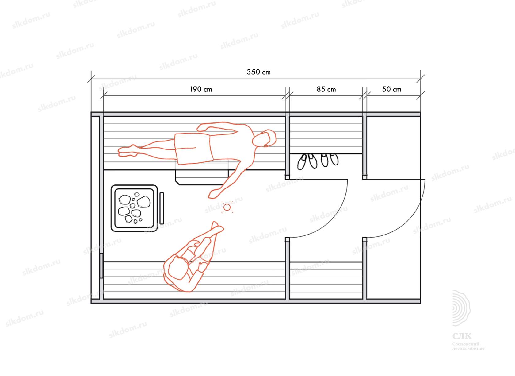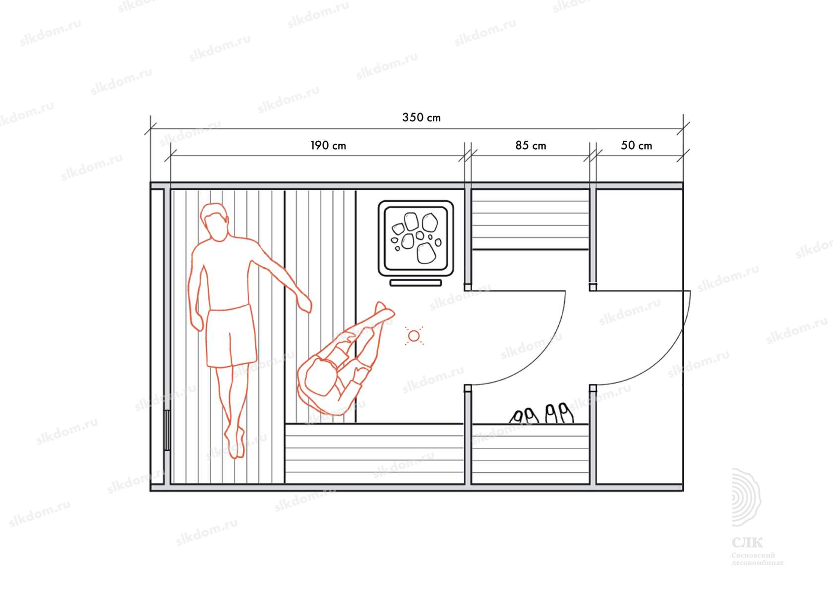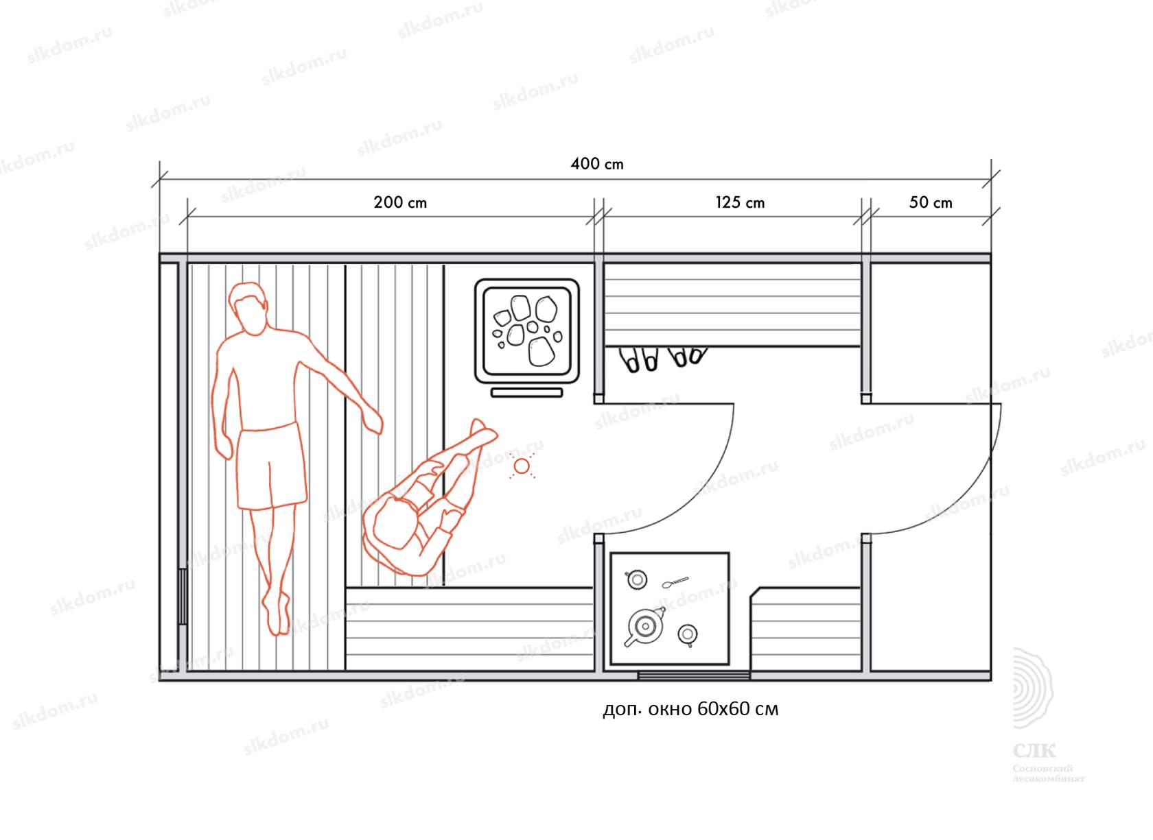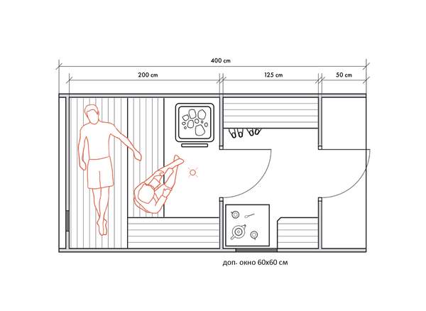 Стены можно двигать - увеличивая или уменьшая помещения, высоту и глубину полков можно менять, расположение тоже, добавлять и убирать дополнительные окна, выносить топку печи или кран с горячей водой за стену. Это все обсуждаемо, мы за расчет не берем деньги! У нас собственное производство, для нас каждая баня - индивидуальная!