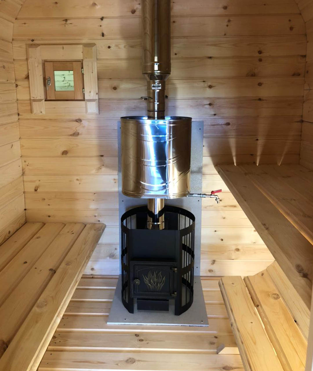 Корпус по наружней стороне стянут обручами из оцинкованного металла толщиной 2 мм, есть возможность подтянуть и ослабить на летний и зимний период использования бани.