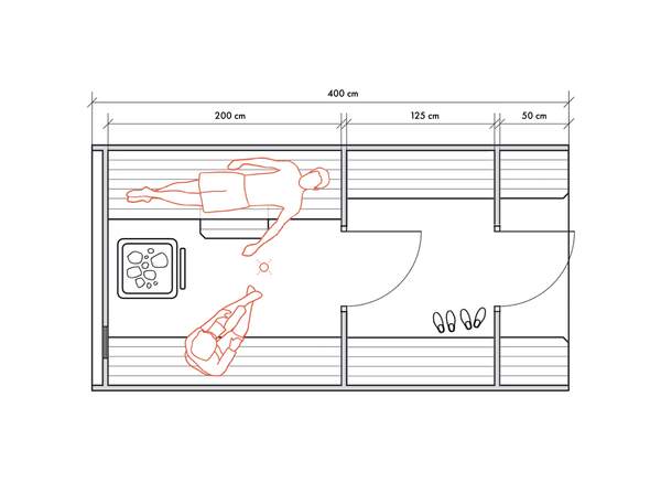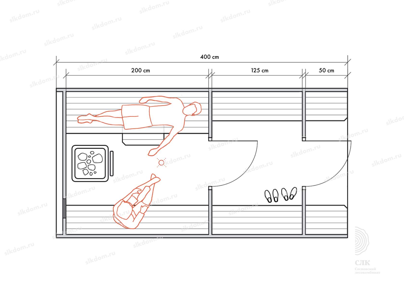 Несмотря на небольшие размеры, в данном типе бань можно обустроить все необходимые для комфортных банных процедур зоны для 2-4 человек.