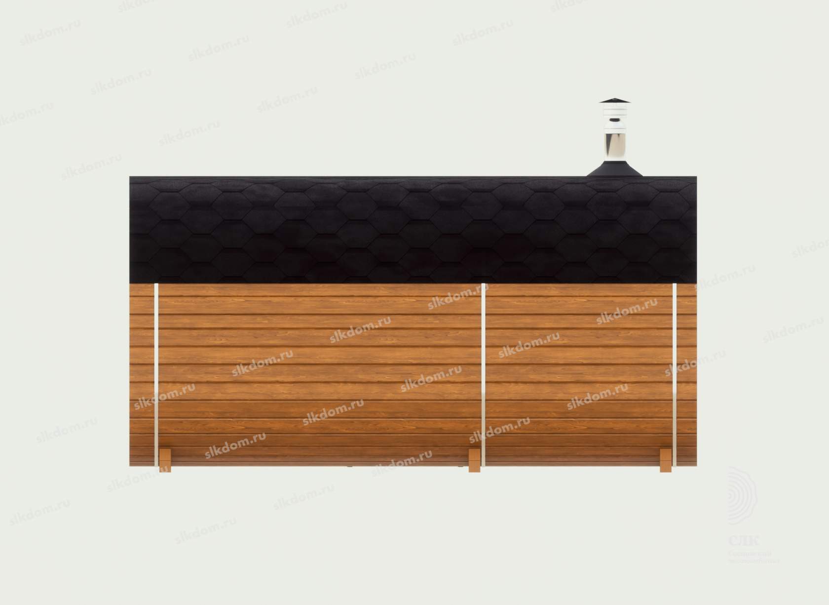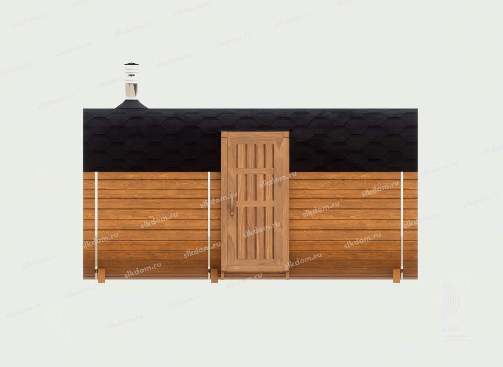 Корпус бани и внутренние перегородки выполнены из сухой доски камерной сушки (влажностью не более 16%), материал хвоя, ламели (доска) запилены в лунный паз и состыкованы между собой, размер 145x45 мм. Ширина и высота корпуса 230 см по внешней стороне.
