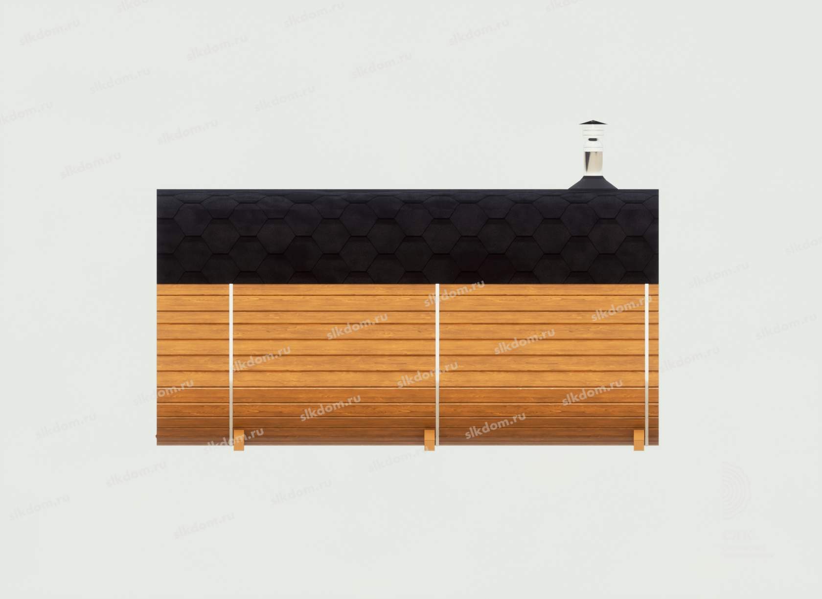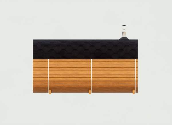 Корпус бани и внутренние перегородки выполнены из сухой доски камерной сушки (влажностью не более 16%), материал хвоя, ламели (доска) запилены в лунный паз и состыкованы между собой, размер 145x45 мм. Ширина и высота корпуса 210 см по внешней стороне.