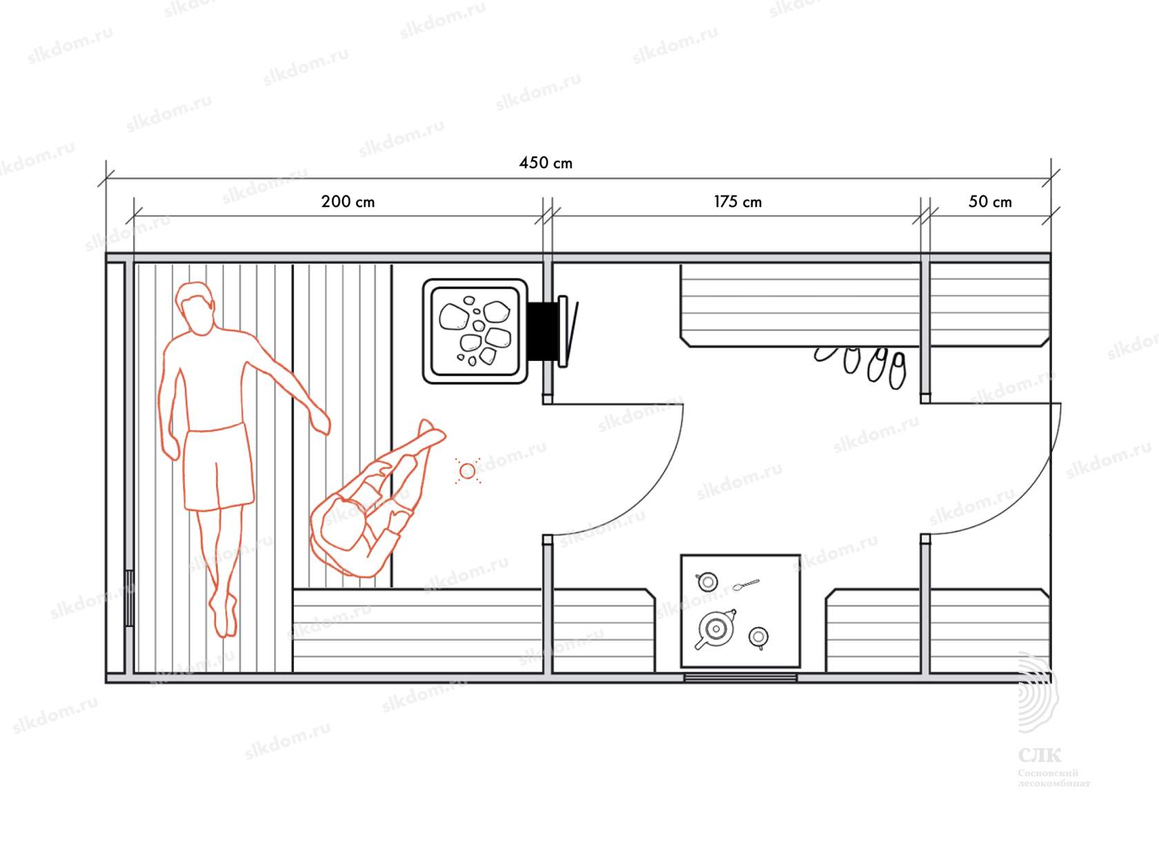 Стены можно двигать - увеличивая или уменьшая помещения, высоту и глубину полков можно менять, расположение тоже, добавлять и убирать дополнительные окна, выносить топку печи или кран с горячей водой за стену. Это все обсуждаемо, мы за расчет не берем деньги! У нас собственное производство, для нас каждая баня - индивидуальная!