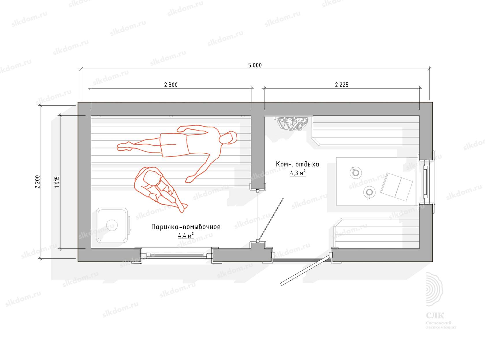 Если планировка предусматривает отдельное помывочное помещение, в таком случае в это помещение добавляется дополнительное деревянное окно 300x300 мм с двойным стеклопакетом для проветривания. В комнате отдыха - окно ламинированное ПВХ 1000x600 мм двойной стеклопакет, поворотно-откидное.