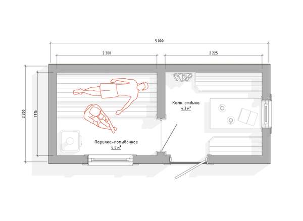 Печь дровяная Везувий с чугунной дверцей, изображена на фото, топка в базовой комплектации осуществляется из парного помещения (топку есть возможность вынести за стену - доп. опция, также печь можно заменить на любую другую, даже электрическую). Защита от нагрева на полу и стене – плита огнезащитная Минерит, толщина 1 см. Камни печные Габбро-диабаз 40 кг для верхней загрузки печи (общая вместимость печи 120 кг, укладываются по бокам, есть возможность заказать под полную загрузку).