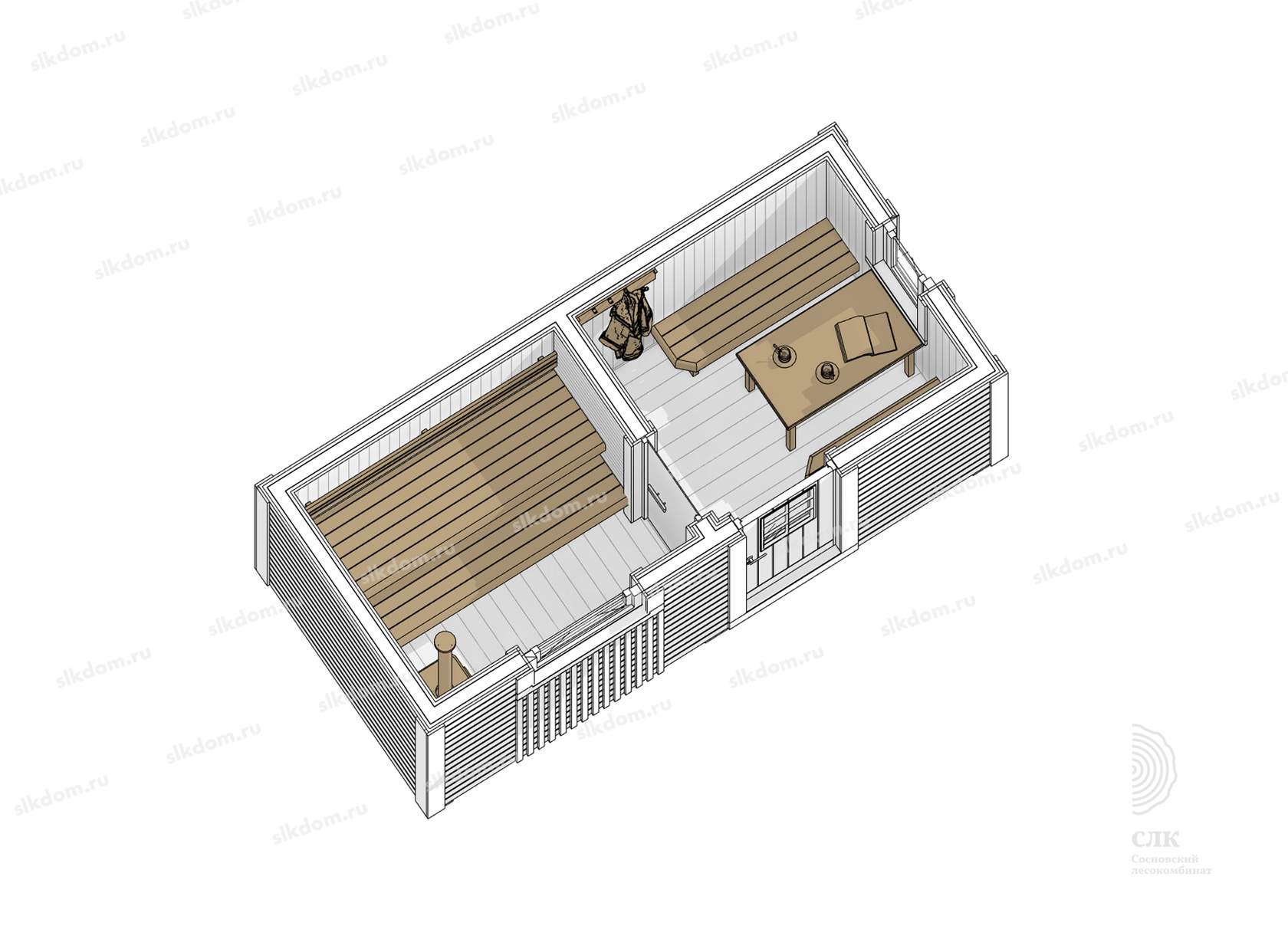 Внутрь уложен утеплитель из каменной ваты базальтовой породы толщиной 100 мм, внутренние перегородки также заполняются утеплителем как и внешние. Защитный слой пароизоляции наружный и внутренний, в парном помещении внутренний слой заменяется на фольгированную пароизоляцию с теплоотражающим покрытием.