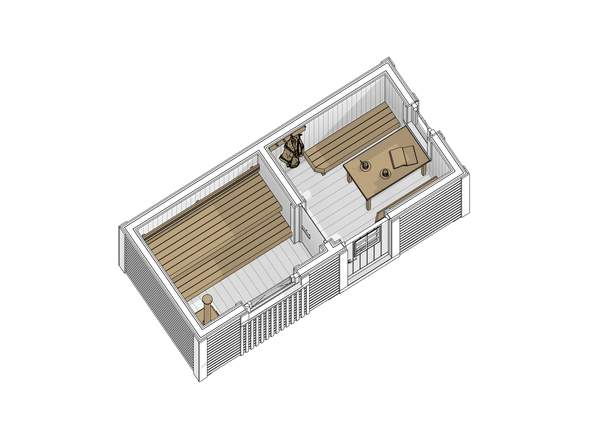 Комфортное размещение от трех до четырех человек. Сделано по каркасной технологии: в стенах, кровле и в полу 100 мм утеплителя. Комплектация бани - готовая к применению после установки на участке.