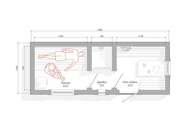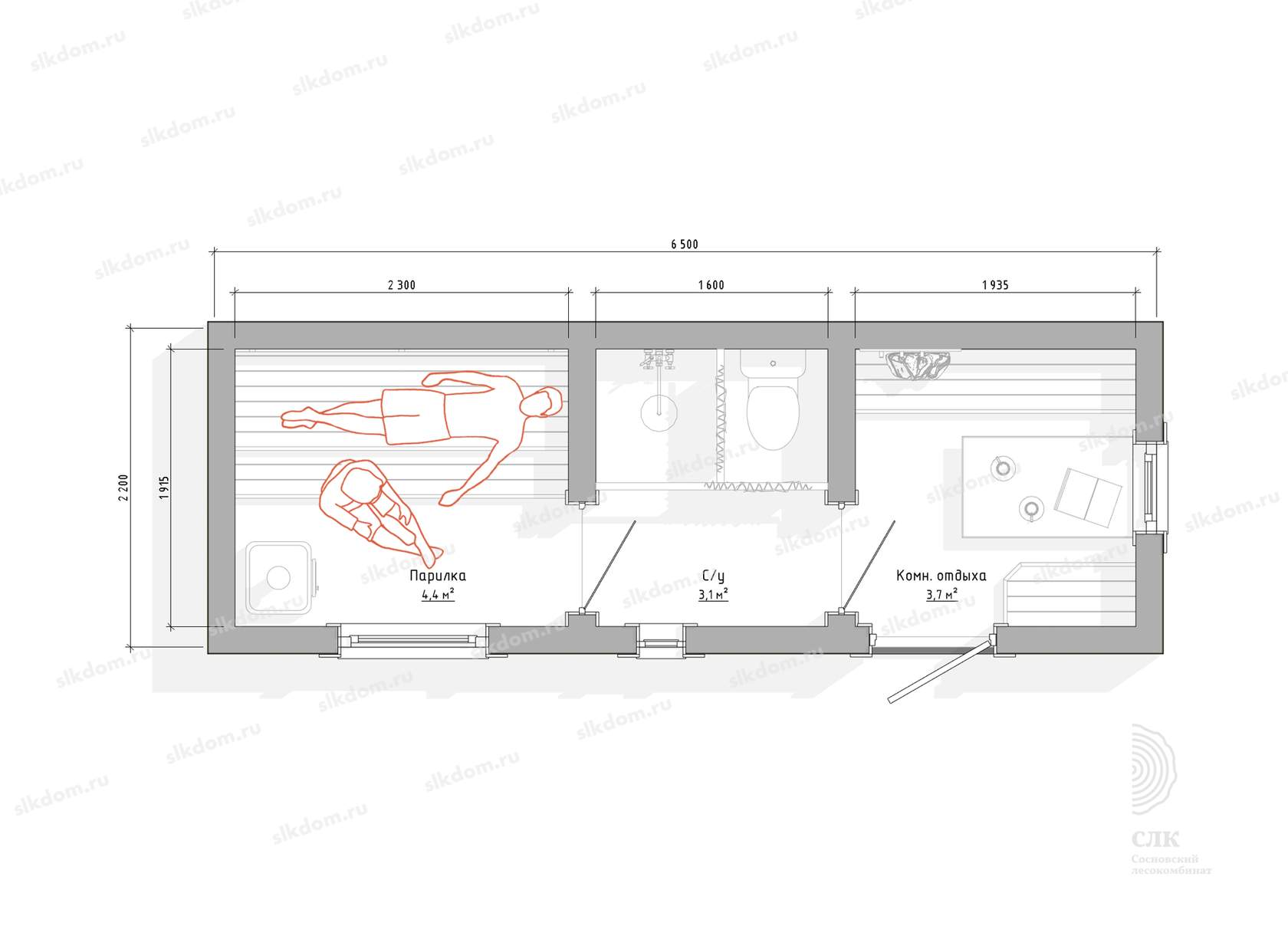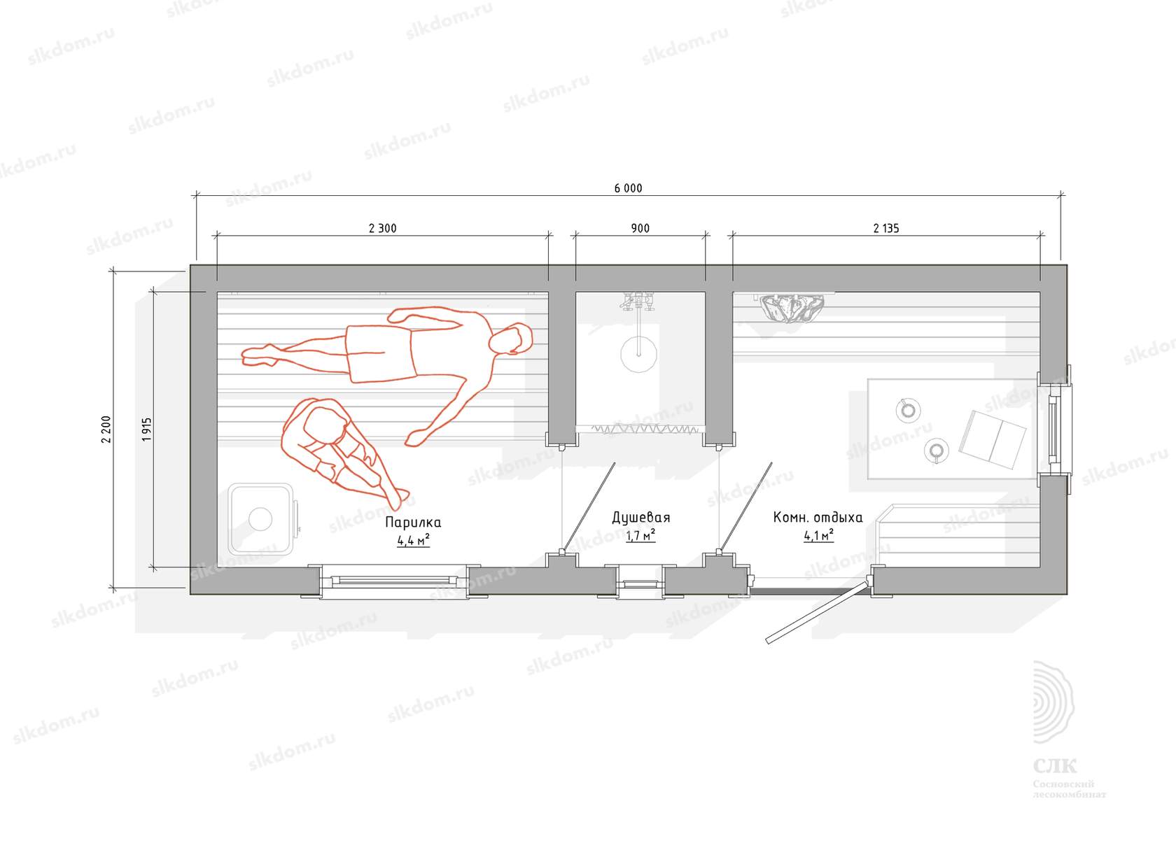 Если планировка предусматривает отдельное помывочное помещение, в таком случае в это помещение добавляется дополнительное деревянное окно 300x300 мм с двойным стеклопакетом для проветривания. В комнате отдыха - окно ламинированное ПВХ 1000x600 мм двойной стеклопакет, поворотно-откидное.