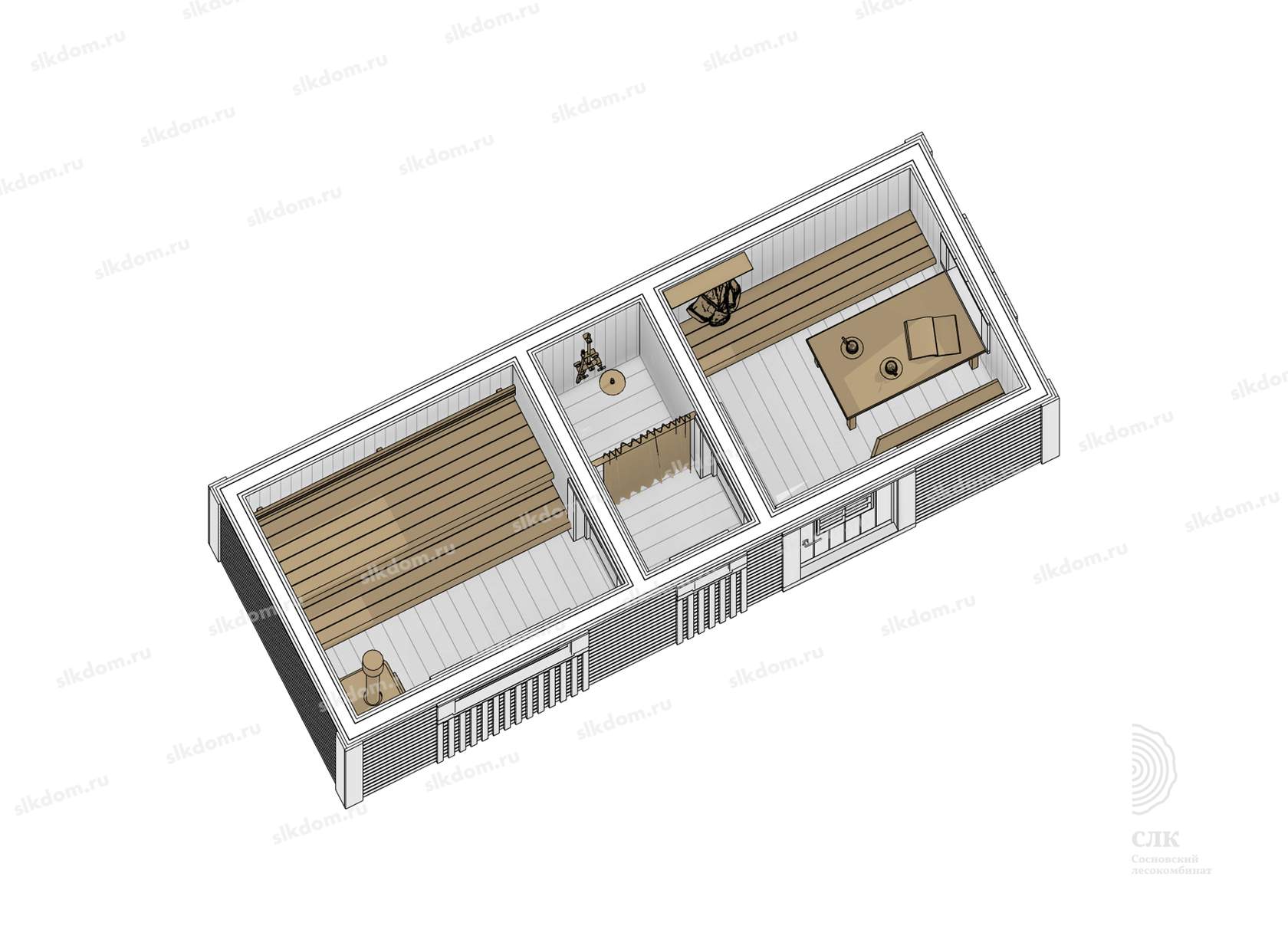 Внутрь уложен утеплитель из каменной ваты базальтовой породы толщиной 100 мм, внутренние перегородки также заполняются утеплителем как и внешние. Защитный слой пароизоляции наружный и внутренний, в парном помещении внутренний слой заменяется на фольгированную пароизоляцию с теплоотражающим покрытием.