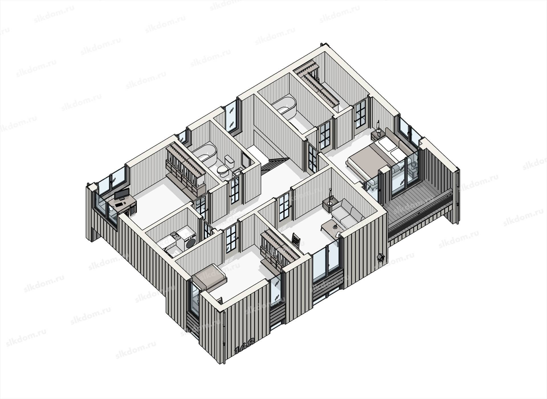 Каркас несущих стен из строганой доски камерной сушки 45х145 мм, плюс дополнительная обрешетка из бруска 45x45 мм материал хвоя - антисептированная (общая толщина внешних стен 190 мм), внутренние перегородки доска 45x95 мм. Изоляция стыков досок каркаса полиэфирным утеплителем. Укосины доска 20х145 мм.