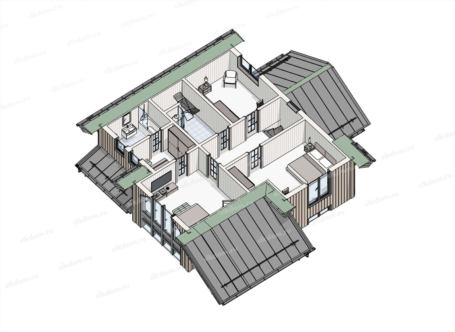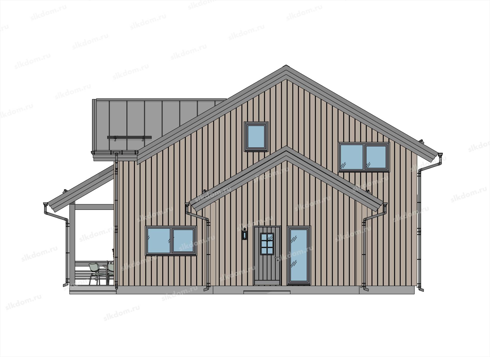 Каркас несущих стен из строганой доски камерной сушки 45х145 мм, плюс дополнительная обрешетка из бруска 45x45 мм материал хвоя - антисептированная (общая толщина внешних стен 190 мм), внутренние перегородки доска 45x95 мм. Изоляция стыков досок каркаса полиэфирным утеплителем. Укосины доска 20х145 мм.